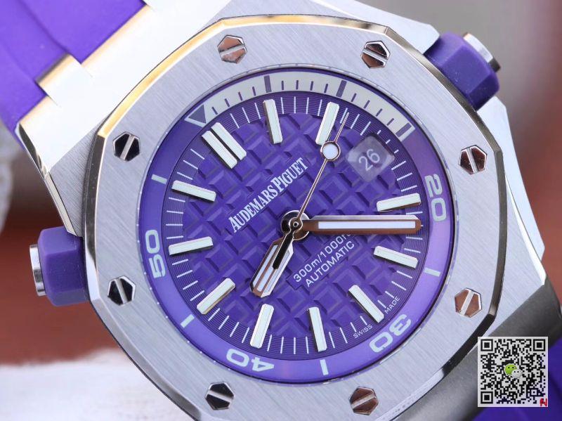 2017 new summer color series, 316L stainless steel case, size 42mm*14.1mm, anti-glare treatment sapphire crystal, blue dial, engraved "Méga Tapisserie" oversized plaid decoration, with white gold fluorescent three-dimensional hour markers and Royal Oak Hands, blue rotating inner bezel with diving scale and white 0 to 15 minutes zone. Audemars Piguet 15710ST.OO.A077CA.01 Replica Watches Screw-in crown with rubber coating, anti-magnetic device. A clone of the genuine Swiss ETA9015 fully automatic mechanical movement, with a power reserve of 60 hours, with diving time measurement, hours, minutes, and central seconds functions. Purple rubber strap with stainless steel pin buckle.