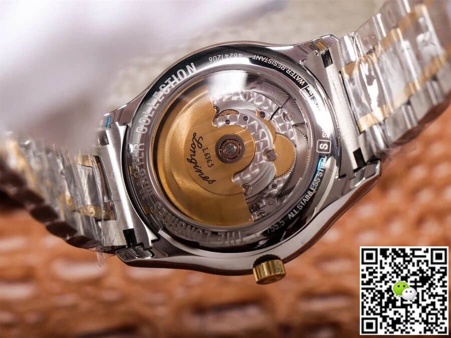 Replica watches. Minute markers around the outer edge. Day and date displayed at 3 o'clock. Longines Calibre L636 automatic movement with 38-hour power reserve. Scratch resistant sapphire crystal. Pull/push crown. Transparent case back. Round case, case size: 38.5 mm, case thickness: 9.5 mm. Bandwidth: 20mm. Push-button folding clasp. Water resistant to 30 meters/100 feet. Functions: date, day, hour, minute, second. Dress watch style.