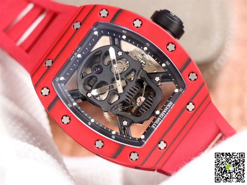 RM052 Skull Tourbillon Replica Watches is a visual interpretation of the skull pattern. The bottom plate and splint of the movement are made of titanium alloy skull, which perfectly integrates the skull pattern into the movement. The bezel and case back cover have been hollowed out, which reduces the overall weight of the watch and is visually consistent with the theme of the skull. The skull on the dial of this Richard Mille RM052-01 Replica Watches is very lifelike and is not inferior to the jewelry design brand in terms of artistic performance. In addition to the frontal visual effects, the skull actually carries the movement part of the watch. The upper and lower jaws of the skeleton hold the ruby of the tourbillon frame, and the back of the skeleton is designed as the central splint of the movement. The hollow floor and plywood have been rigorously tested to ensure that they meet the best strength requirements.