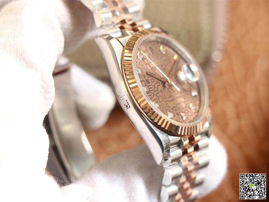 Rolex Datejust 36 series M126231-0025 one-to-one highest version replica watch. Rose gold triangle pit bezel. Replica watches. Swiss ETA3235 automatic movement. Size 36mm. Chocolate dial. Diamond hour markers. The date is displayed at three o'clock with a 2.5x magnification function. Sapphire crystal glass. Folding buckle. Stainless steel strap and case. Water resistant to 50 meters. AAA Replica Rolex Datejust M126231-0025 EW Factory Diamond Brown Dial Mens Watch