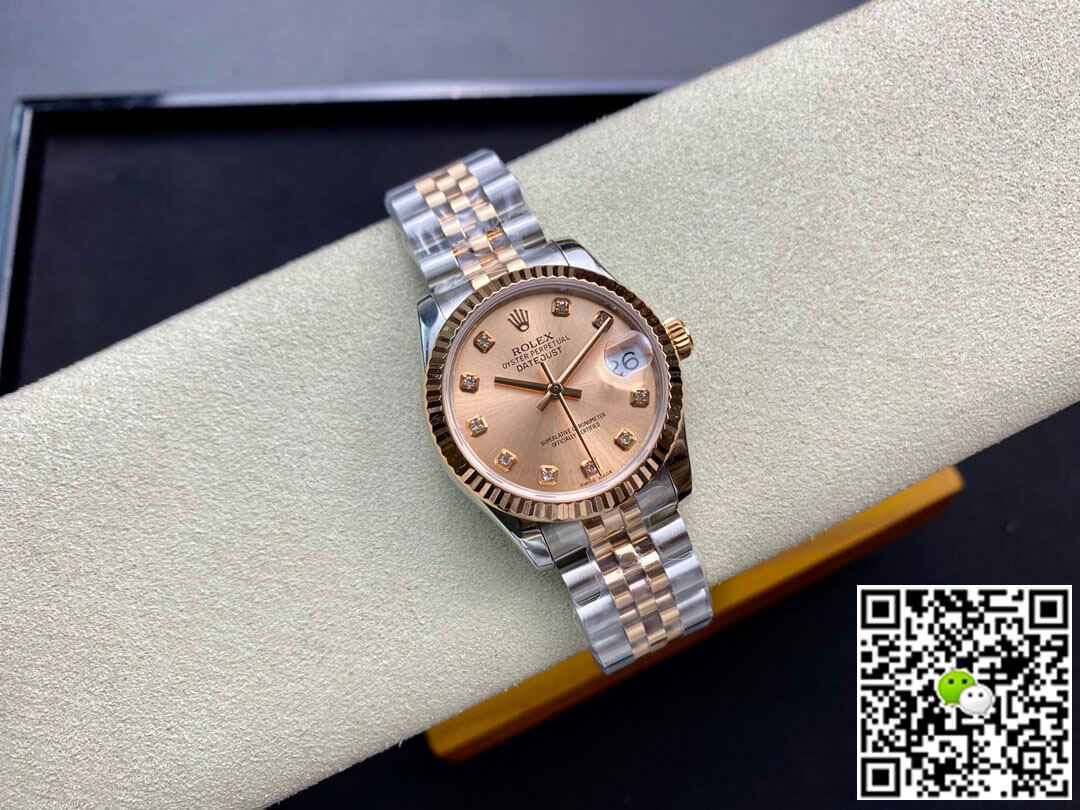 Oyster case, 31 mm, Oystersteel and Everose gold bezel grooves. Waterproof Features Water resistant to 100 meters / 330 feet. Caliber 2236 Perpetual mechanical, self-winding movement, Rolex manufacturer, power reserve approx. Replica watches. 55 hours. Bracelet Jubilee, five-piece link dial with rose-coloured diamonds. The 9999 real gold 0.30mm sheet is wrapped on the surface of 904L steel to keep the gold part of the watch from falling off or discoloring for a long time. AAA Replica Rolex Datejust M278271-0024 31MM BP Factory Diamond Rose Gold Dial Ladies Watch